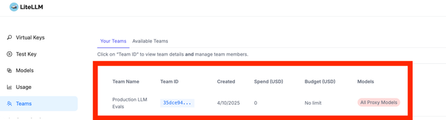 On the LiteLLM UI, Navigate to Teams, You should see the new team Production LLM Evals Group auto-created on LiteLLM.